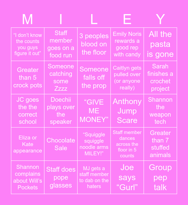 This bingo card has a free space and 24 words: Chocolate Sale, Staff does pope glasses, Someone falls off the prop, Shannon complains about Will’s Pockets, All the pasta is gone, “I don’t know the counts you guys figure it out”, Greater than 5 crock pots, Staff member goes on a food run, Anthony Jump Scare, “Squiggle squiggle noodle arms MILEY!”, Caitlyn gets pulled over (or anyone really), JC goes the the correct school, Staff member dances across the floor in 5 counts, Greater than 7 stuffed animals, Someone catching some Zzzz, Joe says “Gurl”, Shannon the weapon tech, 3 peoples blood on the floor, Sarah finishes a crochet project, Doechii plays over the speaker, Group pep talk, Eliza or Kate appearance, Emily Noris rewards a good rep with candy and MJ gets a staff member to dab on the haters.