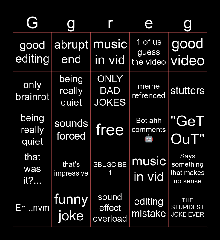 This bingo card has a free space and 28 words: no actual editing, funny joke, music in vid, editing mistake, good video, good editing, being really quiet, sound effect overload, meme refrenced, Says something that makes no sense, that was it?..., sounds forced, music in vid, THE STUPIDEST JOKE EVER, being really quiet, editing mistake, SBUSCIBE 1, 1 of us guess the video, stutters, Eh...nvm, abrupt end, HIT THAT LIKE, SHARE, SBUSCIBE,AND COMMENT 2, that's impressive, ONLY DAD JOKES, Bot ahh comments🤖, "GeT OuT", only brainrot and No brainrot.