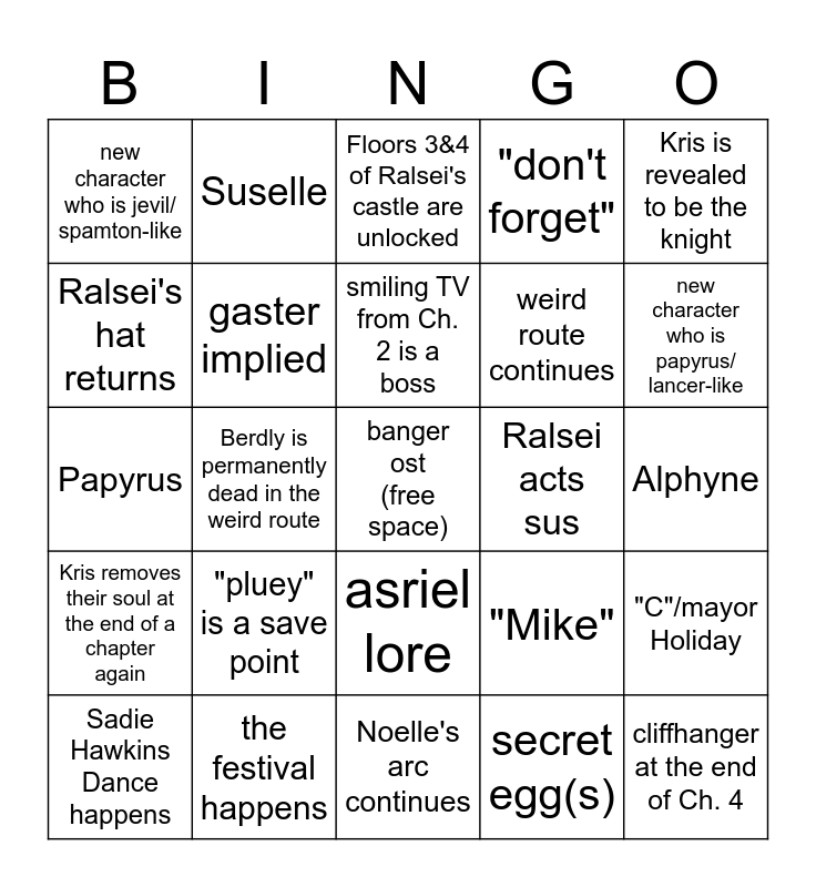 This bingo card has a free space and 24 words: "pluey" is a save point, the festival happens, smiling TV from Ch. 2 is a boss, Sadie Hawkins Dance happens, Kris is revealed to be the knight, new character who is jevil/ spamton-like, Ralsei's hat returns, Suselle, Ralsei acts sus, asriel lore, weird route continues, Papyrus, "Mike", "C"/mayor Holiday, gaster implied, secret egg(s), Alphyne, Floors 3&4 of Ralsei's castle are unlocked, new character who is papyrus/ lancer-like, Berdly is permanently dead in the weird route, cliffhanger at the end of Ch. 4, Kris removes their soul at the end of a chapter again, "don't forget" and Noelle's arc continues.
