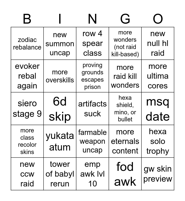 This bingo card has a free space and 24 words: yukata atum, tower of babyl rerun, proving grounds escapes prison, new ccw raid, new null hl raid, zodiac rebalance, evoker rebal again, new summon uncap, hexa shield, mino, or bullet, farmable weapon uncap, more raid kill wonders, siero stage 9, more eternals content, hexa solo trophy, more overskills, fod awk, msq date, row 4 spear class, more ultima cores, 6d skip, gw skin preview, more class recolor skins, more wonders (not raid kill-based) and emp awk lvl 10.