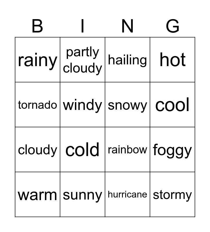 This bingo card has 16 words: sunny, foggy, hailing, rainy, cloudy, partly cloudy, rainbow, hurricane, tornado, windy, warm, hot, cold, cool, snowy and stormy.