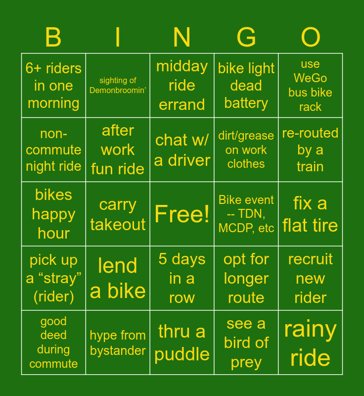This bingo card has a free space and 24 words: lend a bike, hype from bystander, chat w/ a driver, good deed during commute, use WeGo bus bike rack, 6+ riders in one morning, non-commute night ride, sighting of Demonbroomin’, Bike event -- TDN, MCDP, etc, 5 days in a row, dirt/grease on work clothes, bikes happy hour, opt for longer route, recruit new rider, after work fun ride, see a bird of prey, fix a flat tire, midday ride errand, re-routed by a train, carry takeout, rainy ride, pick up a “stray” (rider), bike light dead battery and thru a puddle.