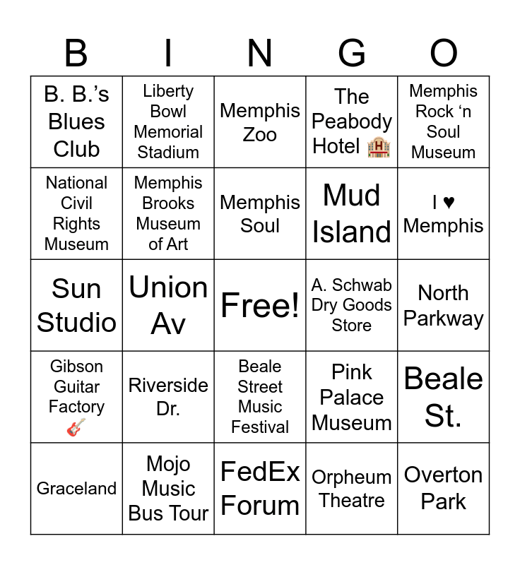 This bingo card has a free space and 30 words: Mojo Music Bus Tour, Memphis Riverboats, Union Av, Gus’s Fried Chicken, B. B.’s Blues Club, Memphis Zoo, Memphis Brooks Museum of Art, Beale Street Music Festival, A. Schwab Dry Goods Store, FedEx Forum, North Parkway, Overton Park, Orpheum Theatre, University of Memphis, I ♥️ Memphis, Shelby Farms, Pink Palace Museum, Gibson Guitar Factory 🎸, Riverside Dr., Memphis Rock ‘n Soul Museum, Sun Studio, World Championship BBQ, Liberty Bowl Memorial Stadium, Mud Island, National Civil Rights Museum, The Peabody Hotel 🏨, Beale St., Graceland, Memphis Soul and MSCS.