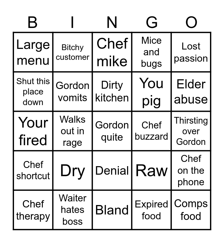 This bingo card has 26 words: Chef shortcut, Waiter hates boss, Dirty kitchen, Expired food, Lost passion, Large menu, Gordon vomits, Chef mike, You pig, Comps food, Shut this place down, Walks out in rage, Bland, Raw, Thirsting over Gordon, Pessimistic employee, Bitchy customer, Denial, Mice and bugs, Chef on the phone, Your fired, Dry, Gordon quite, Chef buzzard, Elder abuse and Chef therapy.