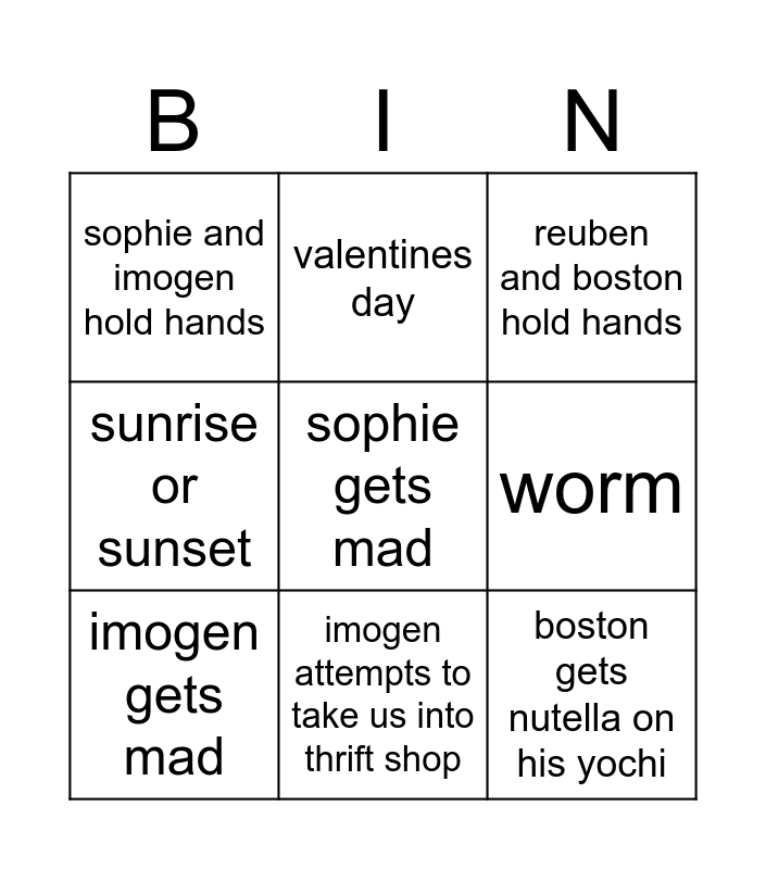 This bingo card has a free space and 8 words: sunrise or sunset, valentines day, worm, imogen gets mad, reuben and boston hold hands, sophie and imogen hold hands, imogen attempts to take us into thrift shop and boston gets nutella on his yochi.