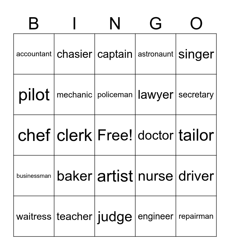 This bingo card has a free space and 24 words: baker, teacher, policeman, waitress, singer, accountant, pilot, chasier, doctor, artist, lawyer, chef, nurse, driver, mechanic, engineer, tailor, captain, secretary, clerk, repairman, businessman, astronaunt and judge.