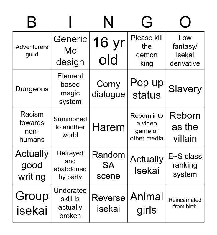 This bingo card has 25 words: Betrayed and ababdoned by party, Reverse isekai, Corny dialogue, Group isekai, Low fantasy/ isekai derivative, Adventurers guild, Dungeons, Generic Mc design, Reborn into a video game or other media, Random SA scene, Pop up status, Racism towards non-humans, Actually Isekai, E~S class ranking system, Element based magic system, Reincarnated from birth, Reborn as the villain, 16 yr old, Slavery, Summoned to another world, Harem, Underated skill is actually broken, Actually good writing, Please kill the demon king and Animal girls.