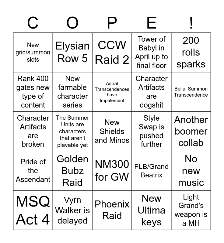 This bingo card has 25 words: Golden Bubz Raid, Phoenix Raid, Astral Transcendences have Impalement, MSQ Act 4, 200 rolls sparks, New grid/summon slots, Rank 400 gates new type of content, Elysian Row 5, Style Swap is pushed further, NM300 for GW, Character Artifacts are dogshit, Character Artifacts are broken, FLB/Grand Beatrix, No new music, New farmable character series, Light Grand's weapon is a MH, Another boomer collab, CCW Raid 2, Belial Summon Transcendence, The Summer Units are characters that aren't playable yet, New Shields and Minos, Vyrn Walker is delayed, Pride of the Ascendant, Tower of Babyl in April up to final floor and New Ultima keys.