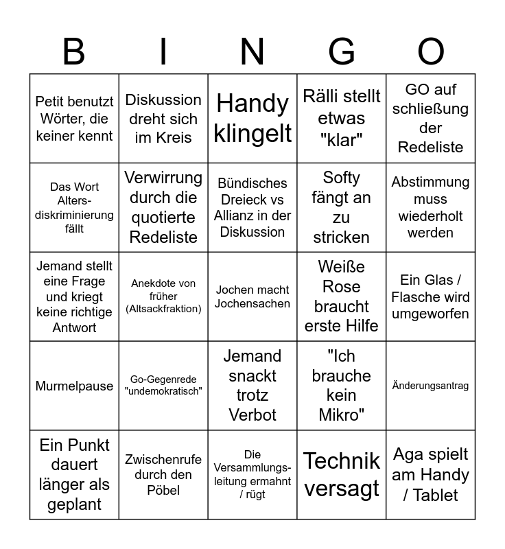 This bingo card has a free space and 24 words: Go-Gegenrede "undemokratisch", Zwischenrufe durch den Pöbel, Bündisches Dreieck vs Allianz in der Diskussion, Ein Punkt dauert länger als geplant, GO auf schließung der Redeliste, Petit benutzt Wörter, die keiner kennt, Das Wort Alters- diskriminierung fällt, Diskussion dreht sich im Kreis, Weiße Rose braucht erste Hilfe, Jemand snackt trotz Verbot, Softy fängt an zu stricken, Jemand stellt eine Frage und kriegt keine richtige Antwort, "Ich brauche kein Mikro", Änderungsantrag, Verwirrung durch die quotierte Redeliste, Technik versagt, Ein Glas / Flasche wird umgeworfen, Handy klingelt, Abstimmung muss wiederholt werden, Anekdote von früher (Altsackfraktion), Aga spielt am Handy / Tablet, Murmelpause, Rälli stellt etwas "klar" and Die Versammlungs-leitung ermahnt / rügt.