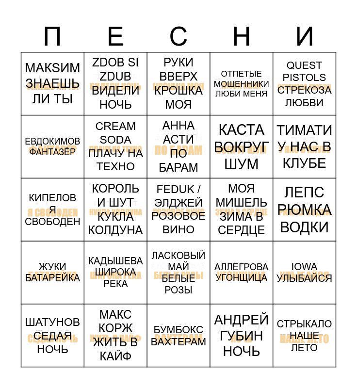 This bingo card has 30 images and 30 words: МАКС КОРЖ ЖИТЬ В КАЙФ, АННА АСТИ ЦАРИЦА, КОРОЛЬ И ШУТ КУКЛА КОЛДУНА, ТОКАРЕВ 7 ЛЕПЕСТОК, МАКSИМ ЗНАЕШЬ ЛИ ТЫ, РУКИ ВВЕРХ КРОШКА МОЯ, CREAM SODA ПЛАЧУ НА ТЕХНО, ЛАСКОВЫЙ МАЙ БЕЛЫЕ РОЗЫ, МОЯ МИШЕЛЬ ЗИМА В СЕРДЦЕ, БУМБОКС ВАХТЕРАМ, ЛЕПС РЮМКА ВОДКИ, FEDUK / ЭЛДЖЕЙ РОЗОВОЕ ВИНО, АНДРЕЙ ГУБИН НОЧЬ, СТРЫКАЛО НАШЕ ЛЕТО, ТИМАТИ У НАС В КЛУБЕ, ЗВЕРИ РАЙОНЫ КВАРТАЛЫ, АЛЛЕГРОВА УГОНЩИЦА, ЖУКИ БАТАРЕЙКА, КАДЫШЕВА ШИРОКА РЕКА, QUEST PISTOLS СТРЕКОЗА ЛЮБВИ, КИПЕЛОВ Я СВОБОДЕН, ПЕВИЦА ЁЛКА НА ШАРЕ, ZDOB SI ZDUB ВИДЕЛИ НОЧЬ, КАСТА ВОКРУГ ШУМ, ЕВДОКИМОВ ФАНТАЗЁР, ОТПЕТЫЕ МОШЕННИКИ ЛЮБИ МЕНЯ, IOWA УЛЫБАЙСЯ, ШАТУНОВ СЕДАЯ НОЧЬ, АННА АСТИ ПО БАРАМ and ЧИЖ & СО О ЛЮБВИ.