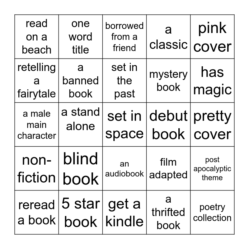 This bingo card has 35 words: fantasy book, finish a series, more than 500 pages, a banned book, an audiobook, a classic, retelling a fairytale, a children’s book, set in the past, finish a book in a day, a male main character, pink cover, complete my reading goal, tandem read, read on a beach, debut book, a thrifted book, a stand alone, non-fiction, set in space, film adapted, reread a book, post apocalyptic theme, 5 star book, borrowed from a friend, has magic, poetry collection, character with my name, mystery book, pretty cover, male author, get a kindle, blind book, one word title and set in hometown.