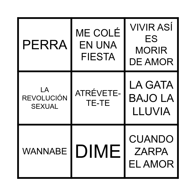 This bingo card has a free space and 29 words: PUEDES CONTAR CONMIGO, EL FIN DEL MUNDO, TENIA TANTO QUE DARTE, DALE DON DALE, VIVIR ASÍ ES MORIR DE AMOR, PERRA, FLOWERS, MARTA, SEBAS, GUILLE Y LOS DEMÁS, NADA QUE PERDER, ZAPATILLAS, LOVE NATURAL, LA CONOCÍ BAILANDO, A QUIÉN LE IMPORTA, EMBORRACHARME, WANNABE, YO QUIERO BAILAR, PRINCESAS, CUANDO TÚ VAS, DIME, LA GOZADERA, HABLANDO EN PLATA, CON ALTURA, CUANDO ZARPA EL AMOR, LA REVOLUCIÓN SEXUAL, ME COLÉ EN UNA FIESTA, LA GATA BAJO LA LLUVIA, POR LA RAJA DE TU FALDA, AÑOS 80 and BESOS.
