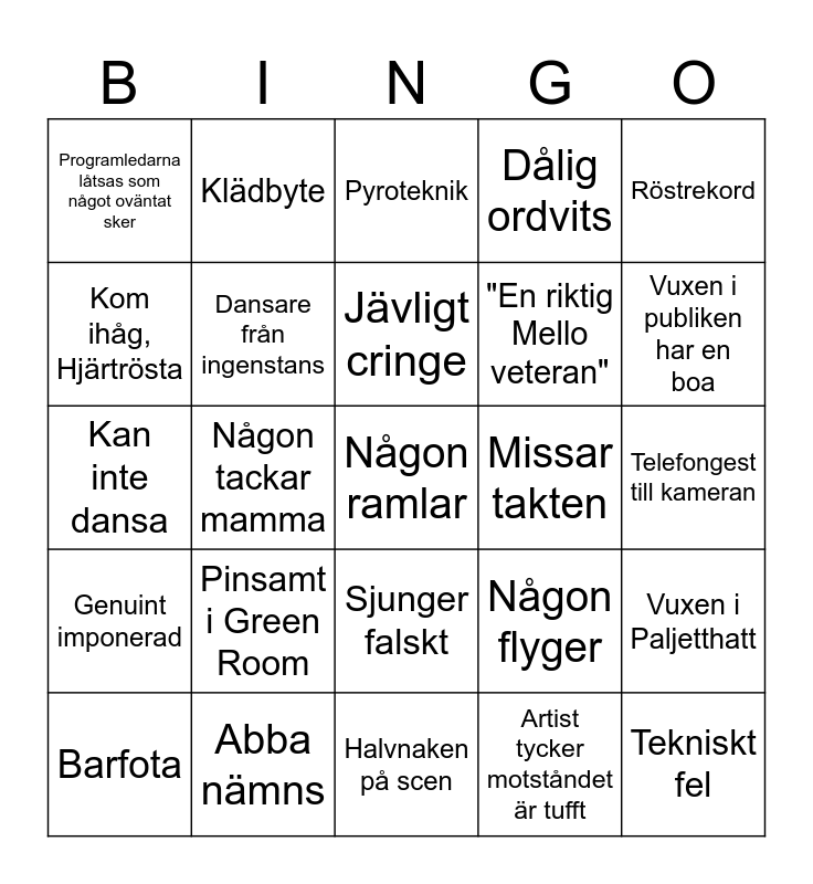 This bingo card has 25 words: Pinsamt i Green Room, Halvnaken på scen, Jävligt cringe, Barfota, Röstrekord, Programledarna låtsas som något oväntat sker, Kom ihåg, Hjärtrösta, Klädbyte, Missar takten, Sjunger falskt, "En riktig Mello veteran", Kan inte dansa, Någon flyger, Vuxen i Paljetthatt, Dansare från ingenstans, Tekniskt fel, Telefongest till kameran, Pyroteknik, Vuxen i publiken har en boa, Någon tackar mamma, Någon ramlar, Abba nämns, Genuint imponerad, Dålig ordvits and Artist tycker motståndet är tufft.