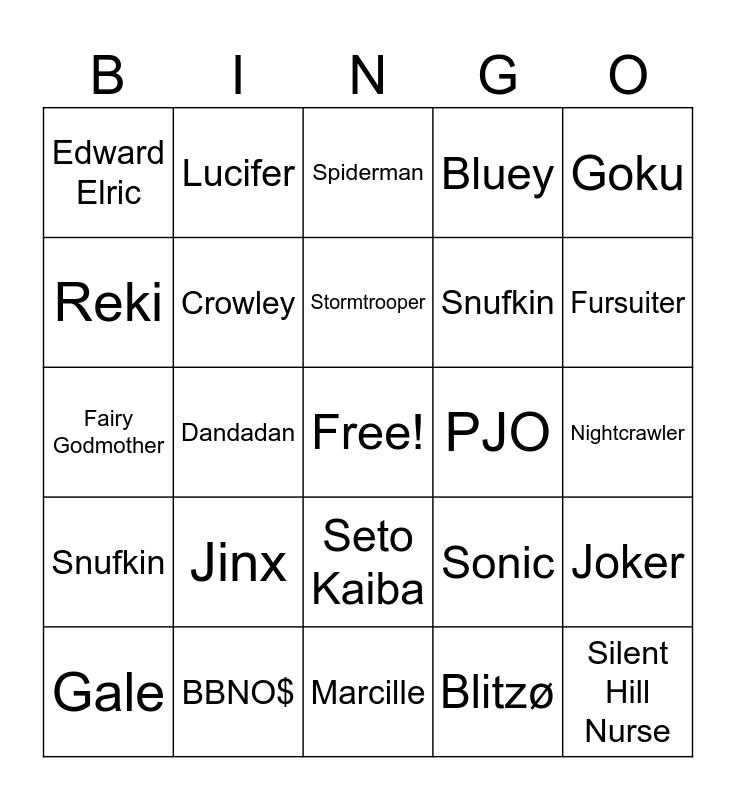 This bingo card has a free space and 24 words: Jinx, BBNO$, Stormtrooper, Gale, Goku, Edward Elric, Reki, Lucifer, PJO, Seto Kaiba, Snufkin, Fairy Godmother, Sonic, Joker, Crowley, Blitzø, Nightcrawler, Spiderman, Fursuiter, Dandadan, Silent Hill Nurse, Snufkin, Bluey and Marcille.