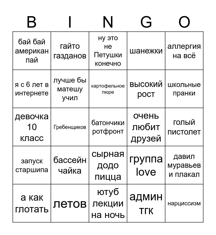 This bingo card has a free space and 24 words: бассейн чайка, летов, картофельное пюре, а как глотать, аллергия на всё, бай бай американ пай, я с 6 лет в интернете, гайто газданов, очень любит друзей, сырная додо пицца, высокий рост, девочка 10 класс, группа love, давил муравьев и плакал, лучше бы матешу учил, админ тгк, голый пистолет, ну это не Петушки конечно, школьные пранки, Гребенщиков, нарциссизм, запуск старшипа, шанежки and ютуб лекции на ночь.