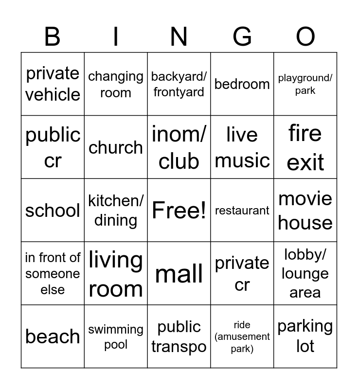 This bingo card has a free space and 24 words: living room, swimming pool, inom/ club, beach, playground/ park, private vehicle, public cr, changing room, restaurant, mall, live music, school, private cr, lobby/ lounge area, church, ride (amusement park), movie house, backyard/ frontyard, fire exit, kitchen/ dining, parking lot, in front of someone else, bedroom and public transpo.