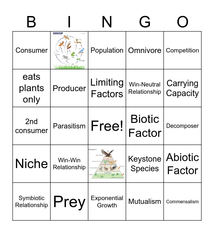 This bingo card has 2 images, a free space and 27 words: Predator, Prey, Population, Host, Competition, Consumer, Producer, Limiting Factors, Biotic Factor, Abiotic Factor, Symbiotic Relationship, Parasitism, Mutualism, Commensalism, 2nd consumer, Ecosystem, Exponential Growth, Keystone Species, Carrying Capacity, Niche, Win-Win Relationship, Autotroph, Win-Neutral Relationship, Decomposer, eats plants only, Omnivore and Heterotroph.