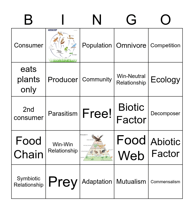 This bingo card has 2 images, a free space and 27 words: Predator, Prey, Population, Host, Competition, Consumer, Producer, Community, Biotic Factor, Abiotic Factor, Symbiotic Relationship, Parasitism, Mutualism, Commensalism, 2nd consumer, Ecosystem, Adaptation, Food Web, Ecology, Food Chain, Win-Win Relationship, Trophic Level, Win-Neutral Relationship, Decomposer, eats plants only, Omnivore and Heterotroph.