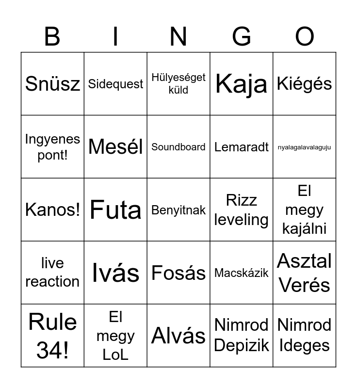This bingo card has 30 words: Rule 34!, Kiverés, Soundboard, buzulás, Kiégés, Snüsz, Sidequest, Fosás, Rizz leveling, Nimrod Ideges, live reaction, Mesél, Ingyenes pont!, Nimrod Depizik, Asztal Verés, Hülye Hangok, Futa, Benyitnak, Macskázik, nyalagalavalaguju, Kanos!, El megy LoL, Hülyeséget küld, Lemaradt, El megy kajálni, Ingyenes pont!, Ivás, Alvás, Kaja and Hideg indítása.