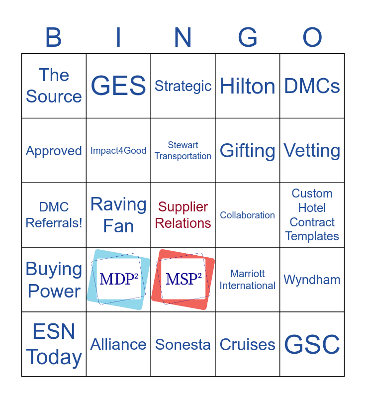 This bingo card has 2 images, a free space and 27 words: ESN Today, Hotels, Raving Fan, Resolution, The Source, Strategic, Impact4Good, Collaboration, Alliance, Custom Hotel Contract Templates, GSC, Sonesta, Cruises, Vetting, PRA, Buying Power, DMCs, DMC Referrals!, Marriott International, AV/Production, Gifting, Approved, Hilton, GES, Wyndham, Stewart Transportation and Maritz.