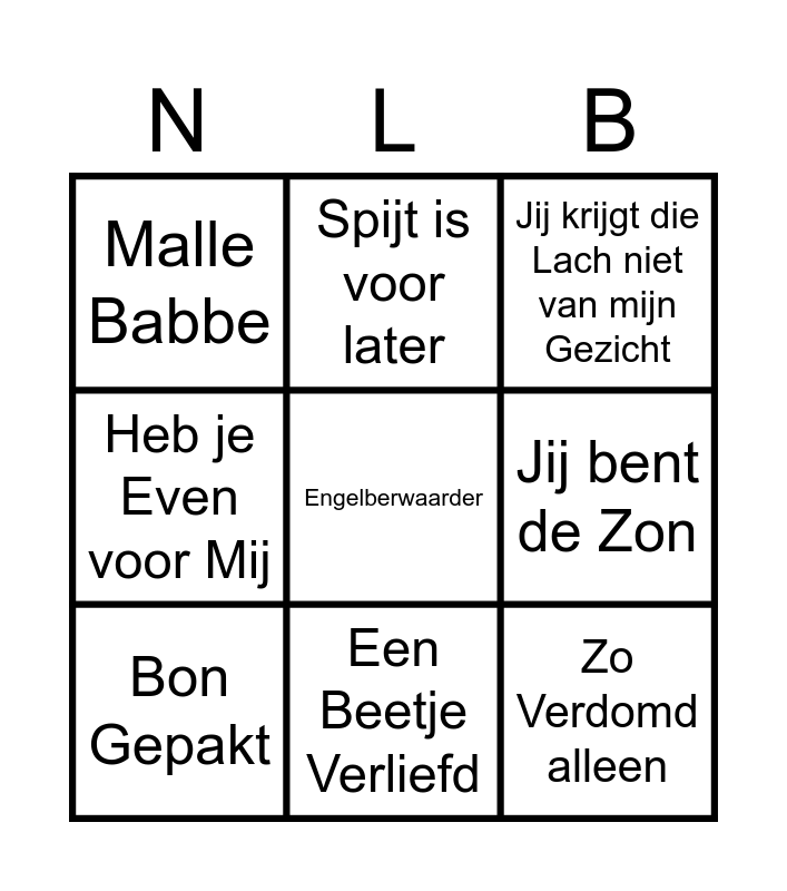 This bingo card has 37 words: Ademnood, Als de Nacht verdwijnt, Blikkendag, Bon Gepakt, Dansplaat, De Toreador, Een Beetje Verliefd, Een Bossie Rode Rozen, Engelberwaarder, Europapa, Even aan mijn Moeder Vragen, Heb je Even voor Mij, Helena, In de Blote Kont, Jij bent de Zon, Jij denkt maar dat je alles mag van Mij, Laat de Zon, Jij krijgt die Lach niet van mijn Gezicht, Leef, Links Rechts, Malle Babbe, Meissie Meissie, Mexico, Noodgeval, Ons Moeder Zeej nog, Sexy als ik Dans, Spijt is voor later, Dondert en het Bliksemt, Terug in de Tijd, Toppertje, Viva Hollandia, Vlieg met mij mee naar de Regenboog, Een Vrijgezel, De Woonboot, Zij gelooft in Mij, Zo Verdomd alleen and Zwemmen in Bacardi Lemon.
