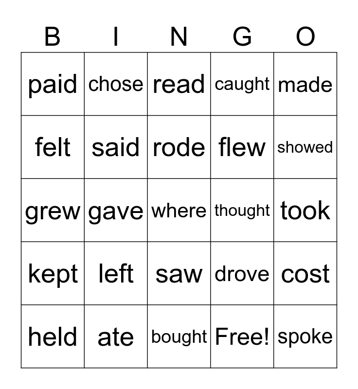 This bingo card has 30 words: ate, forgot, gave, knew, paid, read, said, saw, thought, bought, took, where, Free!, spoke, showed, came, drove, kept, left, made, grew, went, chose, flew, felt, caught, cost, held, rode and wore.