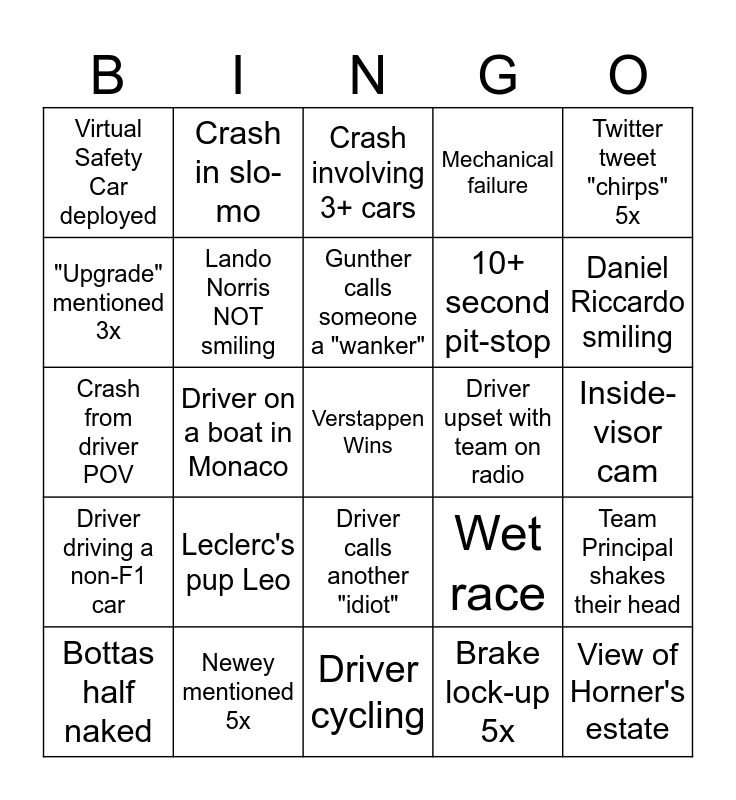 This bingo card has a free space and 24 words: Leclerc's pup Leo, Newey mentioned 5x, Gunther calls someone a "wanker", Bottas half naked, Twitter tweet "chirps" 5x, Virtual Safety Car deployed, "Upgrade" mentioned 3x, Crash in slo-mo, Driver upset with team on radio, Driver calls another "idiot", 10+ second pit-stop, Crash from driver POV, Wet race, Team Principal shakes their head, Lando Norris NOT smiling, Brake lock-up 5x, Inside-visor cam, Crash involving 3+ cars, Daniel Riccardo smiling, Driver on a boat in Monaco, View of Horner's estate, Driver driving a non-F1 car, Mechanical failure and Driver cycling.