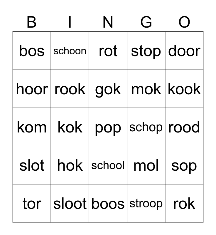 This bingo card has 25 words: hok, boos, gok, tor, door, bos, hoor, schoon, schop, school, mok, kom, mol, sop, rook, rok, rood, rot, kook, kok, pop, sloot, slot, stop and stroop.
