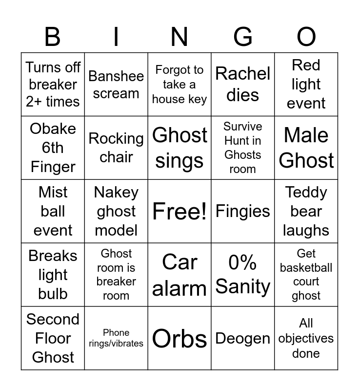 This bingo card has a free space and 40 words: Dirty water, Mist ball event, Emf 5, Rocking chair, Phone rings/vibrates, Car alarm, Ghost sings, Radio turns on, Red light event, Breaks light bulb, Nakey ghost model, Rachel dies, All objectives done, Teddy bear laughs, Fingies, Ghost room is breaker room, Shower turned on, Turns off breaker 2+ times, Poltergeist ability throw, Forgot to take a house key, Get basketball court ghost, Deogen, Survive Hunt in Ghosts room, Obake 6th Finger, Obake Shifts during hunt, Hangman Tarot Card, Instant mare light switch, Ghost tries to open door/locker, A Child!! (ghost), Crying ghost, Ghost under the age of 50, Second Floor Ghost, First Floor Ghost, 0% Sanity, Male Ghost, Orbs, UV, Guessed ghost wrong, Banshee scream and Dots.