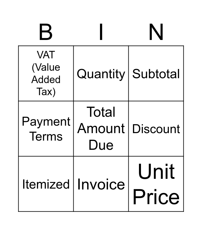 This bingo card has a free space and 10 words: Free!, Invoice, Subtotal, VAT (Value Added Tax), Discount, Itemized, Quantity, Unit Price, Payment Terms and Due Date.