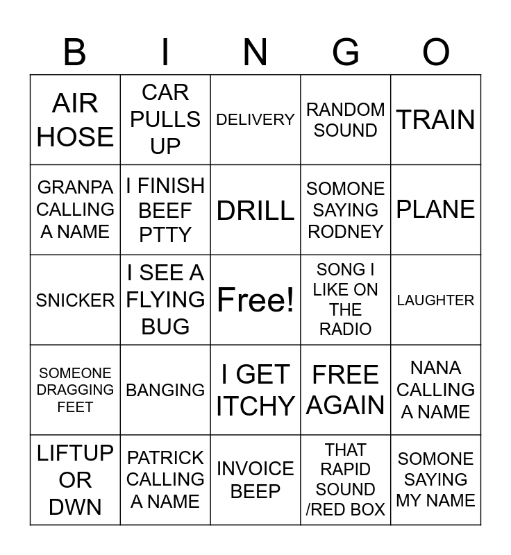 This bingo card has a free space and 24 words: LIFTUP OR DWN, BANGING, DRILL, THAT RAPID SOUND /RED BOX, TRAIN, AIR HOSE, CAR PULLS UP, DELIVERY, SONG I LIKE ON THE RADIO, LAUGHTER, SNICKER, I FINISH BEEF PTTY, FREE AGAIN, NANA CALLING A NAME, GRANPA CALLING A NAME, PATRICK CALLING A NAME, INVOICE BEEP, RANDOM SOUND, PLANE, SOMEONE DRAGGING FEET, I SEE A FLYING BUG, I GET ITCHY, SOMONE SAYING RODNEY and SOMONE SAYING MY NAME.