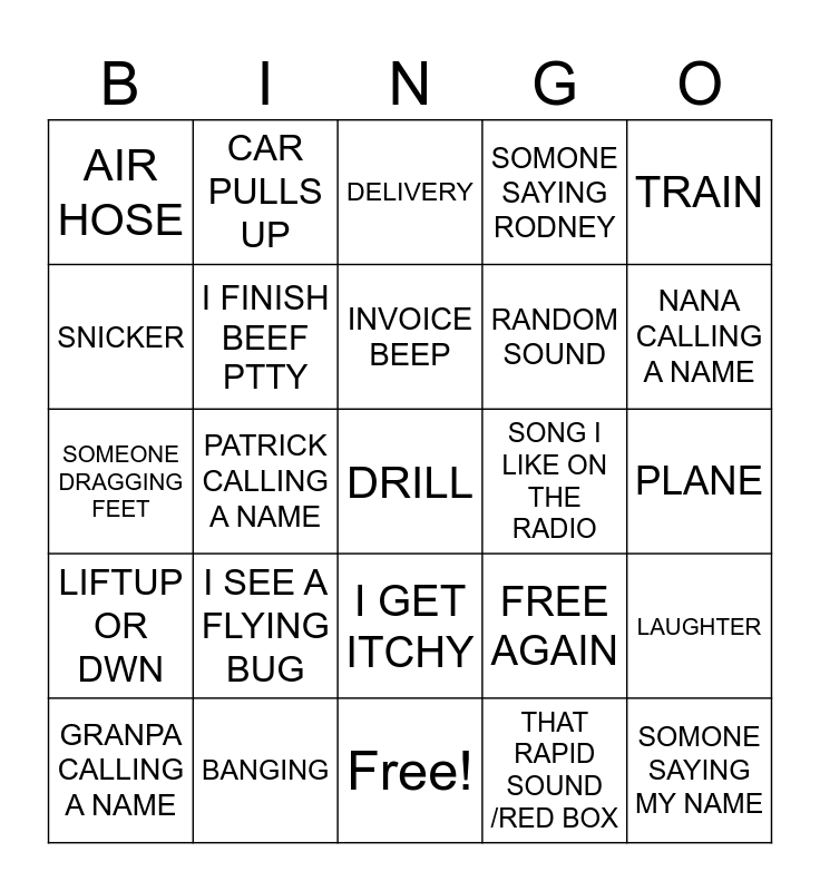 This bingo card has 25 words: LIFTUP OR DWN, BANGING, DRILL, THAT RAPID SOUND /RED BOX, TRAIN, AIR HOSE, CAR PULLS UP, DELIVERY, SONG I LIKE ON THE RADIO, LAUGHTER, SNICKER, I FINISH BEEF PTTY, Free!, FREE AGAIN, NANA CALLING A NAME, GRANPA CALLING A NAME, PATRICK CALLING A NAME, INVOICE BEEP, RANDOM SOUND, PLANE, SOMEONE DRAGGING FEET, I SEE A FLYING BUG, I GET ITCHY, SOMONE SAYING RODNEY and SOMONE SAYING MY NAME.