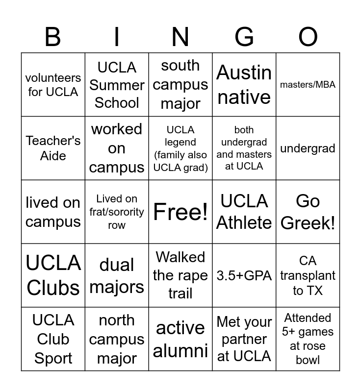 This bingo card has a free space and 30 words: north campus major, transfer, Lived on frat/sorority row, Studied Abroad, volunteers for UCLA, south campus major, worked on campus, Walked the rape trail, UCLA Athlete, active alumni, Go Greek!, Attended 5+ games at rose bowl, Met your partner at UCLA, went to class with a famous person, undergrad, Attended 5+ games at Wooden Center, 3.5+GPA, UCLA Clubs, dual majors, masters/MBA, lived on campus, Graduated w Honors, UCLA Summer School, both undergrad and masters at UCLA, Teacher's Aide, Austin native, CA transplant to TX, UCLA Club Sport, UCLA legend (family also UCLA grad) and Attended 2 alum events last 12 months.