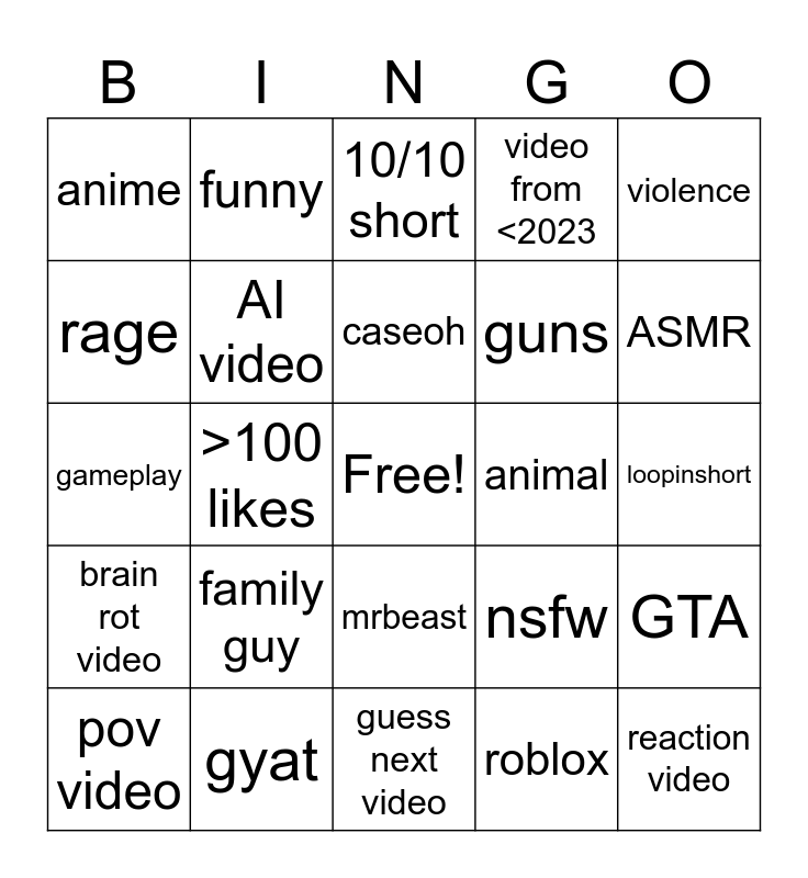 This bingo card has a free space and 24 words: family guy, gyat, caseoh, pov video, violence, anime, rage, funny, animal, mrbeast, guns, gameplay, nsfw, GTA, AI video, roblox, loopinshort, 10/10 short, ASMR, >100 likes, reaction video, brain rot video, video from <2023 and guess next video.