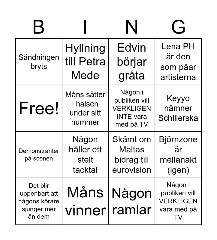 This bingo card has 16 words: Måns vinner, Björnzone är mellanakt (igen), Edvin börjar gråta, Sändningen bryts, Demonstranter på scenen, Hyllning till Petra Mede, Skämt om Maltas bidrag till eurovision, Någon ramlar, Free!, Måns sätter i halsen under sitt nummer, Det blir uppenbart att någons körare sjunger mer än dem, Lena PH är den som påar artisterna, Någon håller ett stelt tacktal, Keyyo nämner Schillerska, Någon i publiken vill VERKLIGEN INTE vara med på TV and Någon i publiken vill VERKLIGEN vara med på TV.