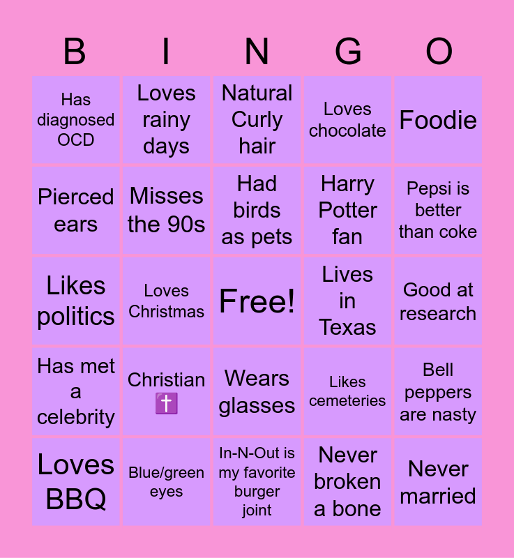 This bingo card has a free space and 24 words: Loves BBQ, Christian ✝️, Had birds as pets, Never broken a bone, Foodie, Has diagnosed OCD, Loves rainy days, Natural Curly hair, Lives in Texas, Good at research, Likes politics, Misses the 90s, Likes cemeteries, Bell peppers are nasty, Pierced ears, Blue/green eyes, In-N-Out is my favorite burger joint, Loves chocolate, Pepsi is better than coke, Has met a celebrity, Loves Christmas, Wears glasses, Harry Potter fan and Never married.