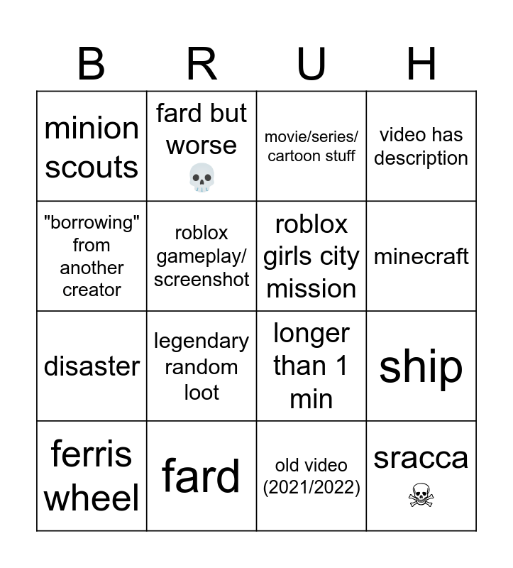 This bingo card has 16 words: fard, ship, movie/series/ cartoon stuff, minion scouts, disaster, fard but worse💀, longer than 1 min, old video (2021/2022), "borrowing" from another creator, roblox gameplay/ screenshot, ferris wheel, video has description, legendary random loot, minecraft, roblox girls city mission and sracca ☠.