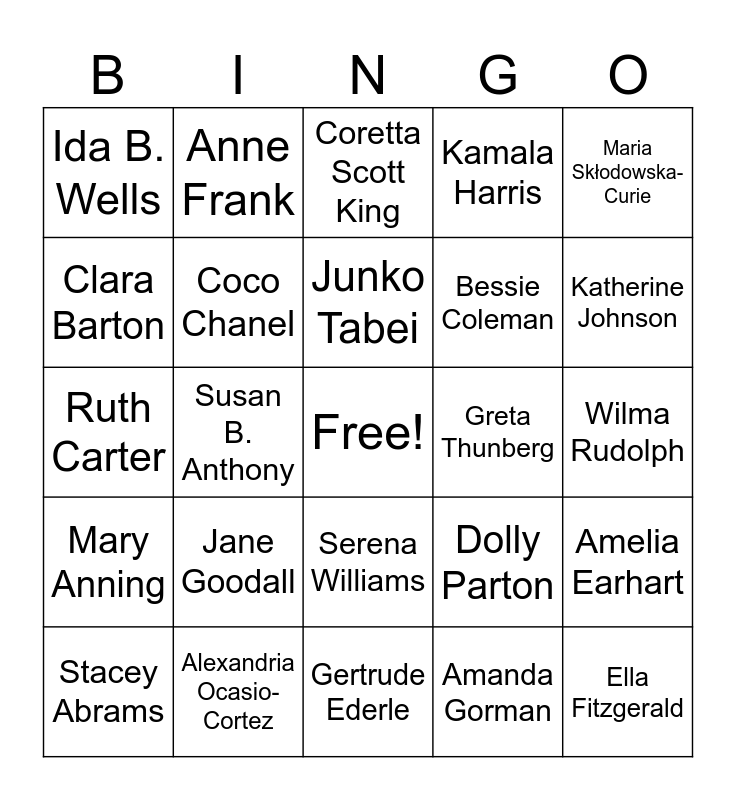 This bingo card has a free space and 50 words: Ada Lovelace, Alexandria Ocasio-Cortez, Alice Walker, Amanda Gorman, Amelia Earhart, Ann Makosinski, Anne Frank, Aretha Franklin, Bessie Coleman, Chloé Zhao, Clara Barton, Coco Chanel, Dolly Parton, Ella Fitzgerald, Fannie Lou Hamer, Frida Kahlo, Coretta Scott King, Greta Thunberg, Harriet Tubman, Ida B. Wells, Jane Goodall, Gertrude Ederle, Kamala Harris, Katherine Johnson, Madam CJ Walker, Mae Jemison, Junko Tabei, Margaret Hamilton, Maria Skłodowska-Curie, Mary Anning, Maya Angelou, Malala Yousafzai, Michelle Obama, Misty Copeland, Nellie Bly, Rita Moreno, Mazie Hirono, Rosalind Franklin, Ruth Bader Ginsburg, Ruth Carter, Sally Ride, Rosa Parks, Shirley Chisholm, Simon Biles, Stacey Abrams, Susan B. Anthony, Serena Williams, Wangarĩ Maathai, Wilma Rudolph and Viola Davis.
