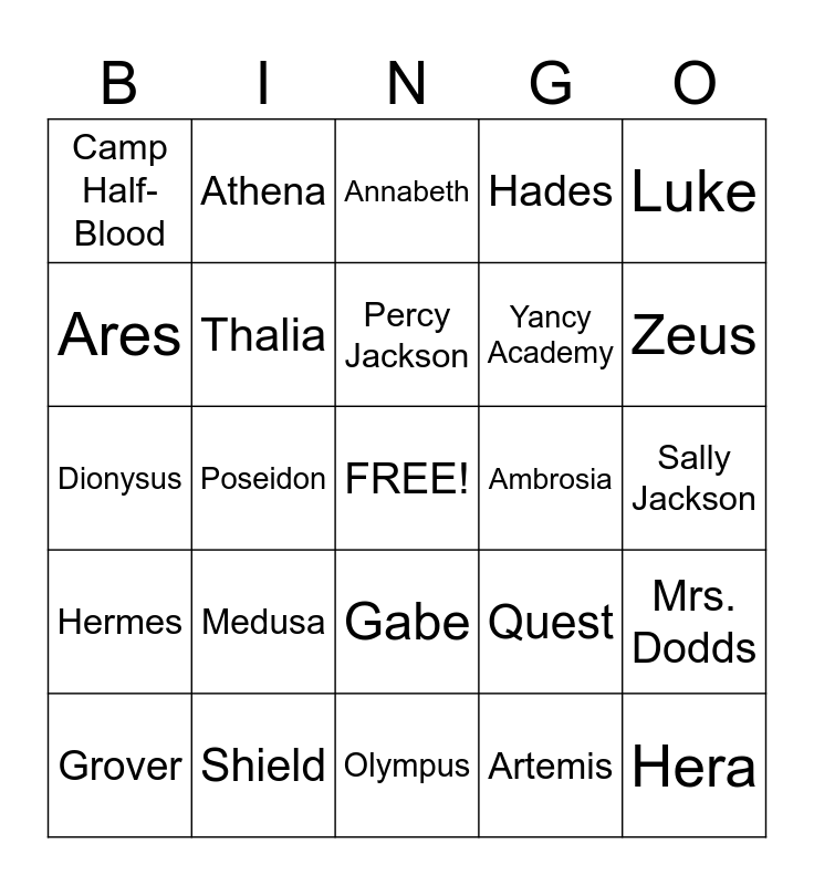 This bingo card has a free space and 24 words: Grover, Medusa, Percy Jackson, Artemis, Luke, Camp Half-Blood, Athena, Annabeth, Ambrosia, Sally Jackson, Dionysus, Thalia, Quest, Mrs. Dodds, Ares, Shield, Olympus, Hades, Zeus, Hermes, Poseidon, Gabe, Yancy Academy and Hera.