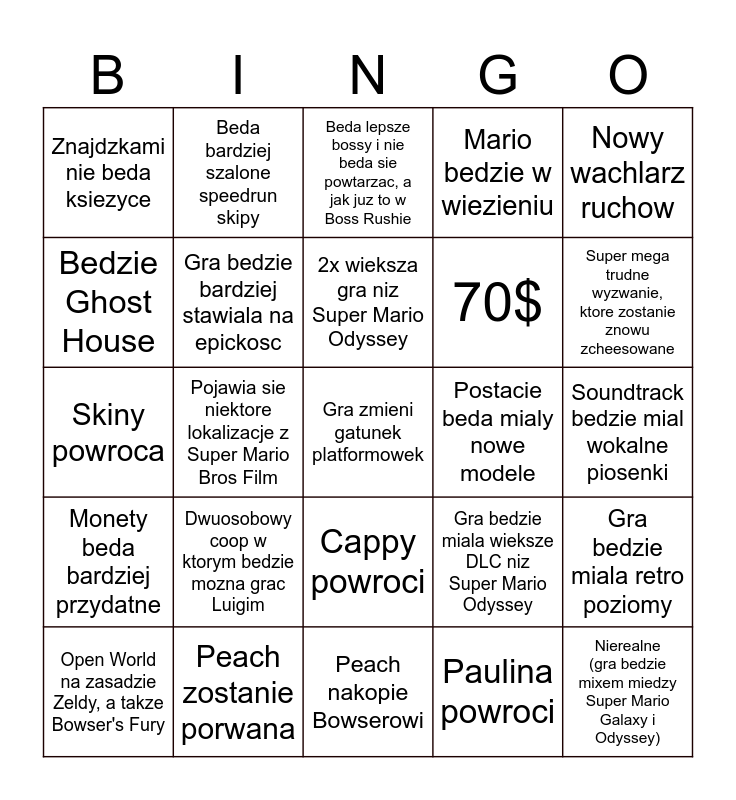 This bingo card has a free space and 24 words: Dwuosobowy coop w ktorym bedzie mozna grac Luigim, Peach zostanie porwana, 2x wieksza gra niz Super Mario Odyssey, Open World na zasadzie Zeldy, a takze Bowser's Fury, Nowy wachlarz ruchow, Znajdzkami nie beda ksiezyce, Bedzie Ghost House, Beda bardziej szalone speedrun skipy, Postacie beda mialy nowe modele, Cappy powroci, 70$, Skiny powroca, Gra bedzie miala wieksze DLC niz Super Mario Odyssey, Gra bedzie miala retro poziomy, Gra bedzie bardziej stawiala na epickosc, Paulina powroci, Soundtrack bedzie mial wokalne piosenki, Beda lepsze bossy i nie beda sie powtarzac, a jak juz to w Boss Rushie, Super mega trudne wyzwanie, ktore zostanie znowu zcheesowane, Pojawia sie niektore lokalizacje z Super Mario Bros Film, Nierealne (gra bedzie mixem miedzy Super Mario Galaxy i Odyssey), Monety beda bardziej przydatne, Mario bedzie w wiezieniu and Peach nakopie Bowserowi.