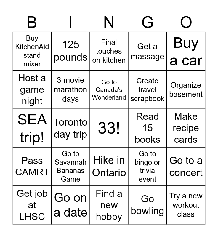 This bingo card has a free space and 24 words: Go to Savannah Bananas Game, Go on a date, Go to Canada’s Wonderland, Get job at LHSC, Buy a car, Buy KitchenAid stand mixer, Host a game night, 125 pounds, Read 15 books, Hike in Ontario, Create travel scrapbook, SEA trip!, Go to bingo or trivia event, Go to a concert, 3 movie marathon days, Go bowling, Make recipe cards, Final touches on kitchen, Organize basement, Toronto day trip, Try a new workout class, Pass CAMRT, Get a massage and Find a new hobby.