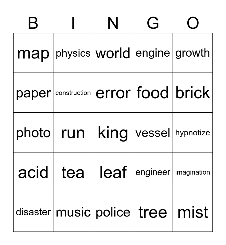 This bingo card has a free space and 24 words: tea, music, error, disaster, growth, map, paper, physics, vessel, leaf, food, photo, engineer, imagination, construction, tree, hypnotize, world, brick, run, mist, acid, engine and police.