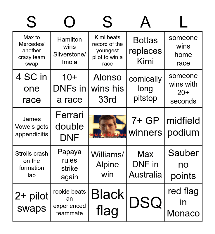 This bingo card has a free space and 24 words: Papaya rules strike again, rookie beats an experienced teammate, Alonso wins his 33rd, 2+ pilot swaps, someone wins home race, Max to Mercedes/ another crazy team swap, 4 SC in one race, Hamilton wins Silverstone/ Imola, 7+ GP winners, Williams/ Alpine win, comically long pitstop, James Vowels gets appendicitis, Max DNF in Australia, Sauber no points, 10+ DNFs in a race, DSQ, midfield podium, Kimi beats record of the youngest pilot to win a race, someone wins with 20+ seconds, Ferrari double DNF, red flag in Monaco, Strolls crash on the formation lap, Bottas replaces Kimi and Black flag.