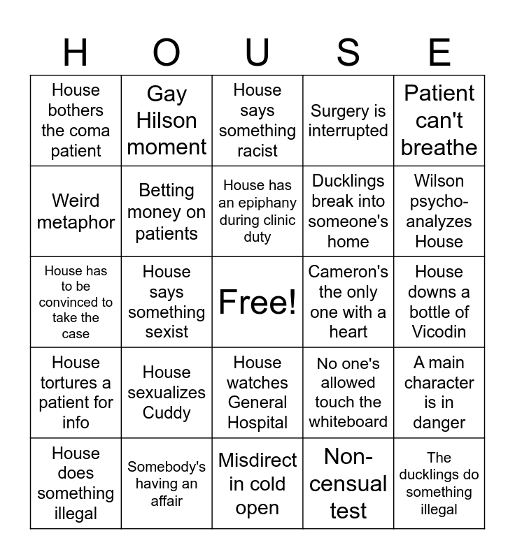 This bingo card has a free space and 24 words: House sexualizes Cuddy, Somebody's having an affair, House has an epiphany during clinic duty, House does something illegal, Patient can't breathe, House bothers the coma patient, Weird metaphor, Gay Hilson moment, Cameron's the only one with a heart, House watches General Hospital, Ducklings break into someone's home, House has to be convinced to take the case, No one's allowed touch the whiteboard, A main character is in danger, Betting money on patients, Non-censual test, House downs a bottle of Vicodin, House says something racist, Wilson psycho-analyzes House, House says something sexist, The ducklings do something illegal, House tortures a patient for info, Surgery is interrupted and Misdirect in cold open.