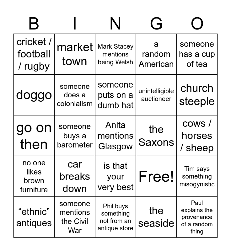 This bingo card has 25 words: car breaks down, Phil buys something not from an antique store, someone puts on a dumb hat, “ethnic” antiques, someone has a cup of tea, cricket / football / rugby, doggo, market town, the Saxons, is that your very best, unintelligible auctioneer, go on then, Free!, Tim says something misogynistic, someone does a colonialism, Paul explains the provenance of a random thing, cows / horses / sheep, Mark Stacey mentions being Welsh, church steeple, someone buys a barometer, Anita mentions Glasgow, someone mentions the Civil War, no one likes brown furniture, a random American and the seaside.