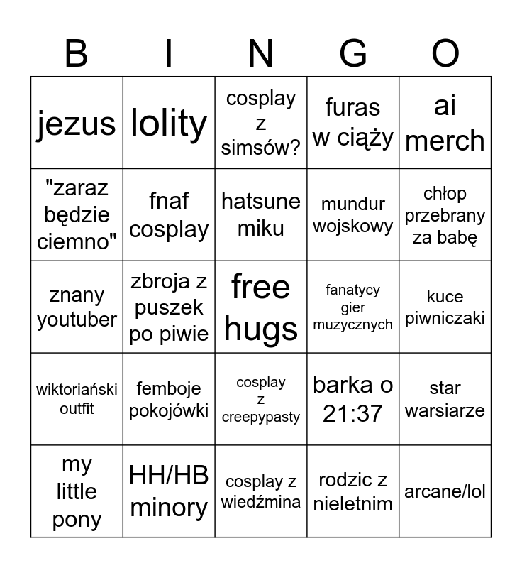 This bingo card has a free space and 24 words: femboje pokojówki, HH/HB minory, hatsune miku, my little pony, ai merch, jezus, "zaraz będzie ciemno", lolity, fanatycy gier muzycznych, cosplay z creepypasty, mundur wojskowy, znany youtuber, barka o 21:37, star warsiarze, fnaf cosplay, rodzic z nieletnim, kuce piwniczaki, cosplay z simsów?, chłop przebrany za babę, zbroja z puszek po piwie, arcane/lol, wiktoriański outfit, furas w ciąży and cosplay z wiedźmina.