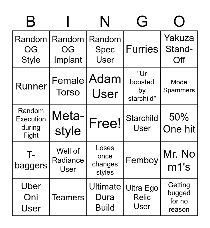 This bingo card has a free space and 24 words: Uber Oni User, Well of Radiance User, Adam User, Ultra Ego Relic User, Yakuza Stand-Off, Random OG Style, Random OG Implant, Random Spec User, Starchild User, 50% One hit, Random Execution during Fight, Female Torso, Femboy, Mr. No m1's, Runner, Teamers, Ultimate Dura Build, Furries, Mode Spammers, T-baggers, Meta-style, Loses once changes styles, "Ur boosted by starchild" and Getting bugged for no reason.