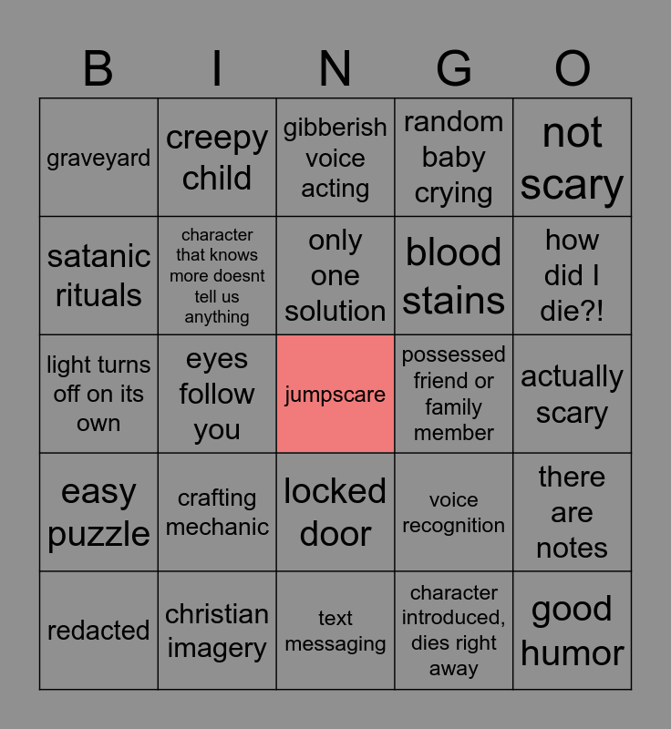 This bingo card has a free space and 140 words: random juimpscare, mannequins, noise in the distance, game crashes, flashlight, voice recognition, PT like, I'm killed, you can hide, VHS filter, being chased, chracters acting like there's no danger, head with no face, flashback, mini game, a game in a game, messages on the wall, door opens on its own, it's a stalker situation, obvious red flags, stamina, there are notes, puzzle, typo, creepy painting, eyes follow you, creepy child, creepy doll, there's a cat, labyrinth, no lore, FNAF like, too easy, actually scary, ghost, we're the bad guy, stealth doesn't work, car broke down, blood stains, weeping angel type enemy, no common sense, everyone seems sus, locked door, gets stuck on a puzzle, husband is the murderer, TRAUMA, failed experiment, missing person, dirty bathroom, random scream, body disappeared, only item is flashlight, redacted, goofy creature, bad facial animation, only have hands, found footage, walking simulator, no mirror reflection, anomaly game, useless cop, character introduced, dies right away, random phone call, lots of reading, poorly scaled items, easy puzzle, too many jumpscares, character makes dumb decision, you have to go to the basement, "where is everyone?", amnesia, graveyard, light turns off on its own, nobody has a phone i guess?, only candles no light, one time use item, it was just a dream, physical save device, random baby crying, bad voice acting, no voice acting, something on the road, person in the corner, how did I not die?!, how did I die?!, eyes in the dark, possessed friend or family member, power outage, text messaging, someone looking at you through a window, you have to repair something, in the woods, inspired by real events, christian imagery, loud footseps, running sound, illegible font, the place is haunted, asylum, whispering, satanic rituals, monster isn't scary, vent crawling, it's a cult, only one solution, multiple choices for dialog, QTEs, bug, sanity meter, crafting mechanic, you can heal yourself, you can't shoot the padlock, not scary, good humor, red means danger, character that knows more doesnt tell us anything, creepy guy, fog, PS1/ PS2 graphics, loud banging/ knocking, gore, corpse/ body parts, can only hold one item, "osbtacle" in the way you could climb over, no settings, writing in blood, locker hiding, steam leak jumpscare, ladder breaks, child toy/plushie, inscription in blood, pentagram, light flicker, we have a dark past, unlimited ammo, gibberish voice acting, obvious bad guy we still trust, creepy bathroom, someone coming out of a bathtub and cute demon.