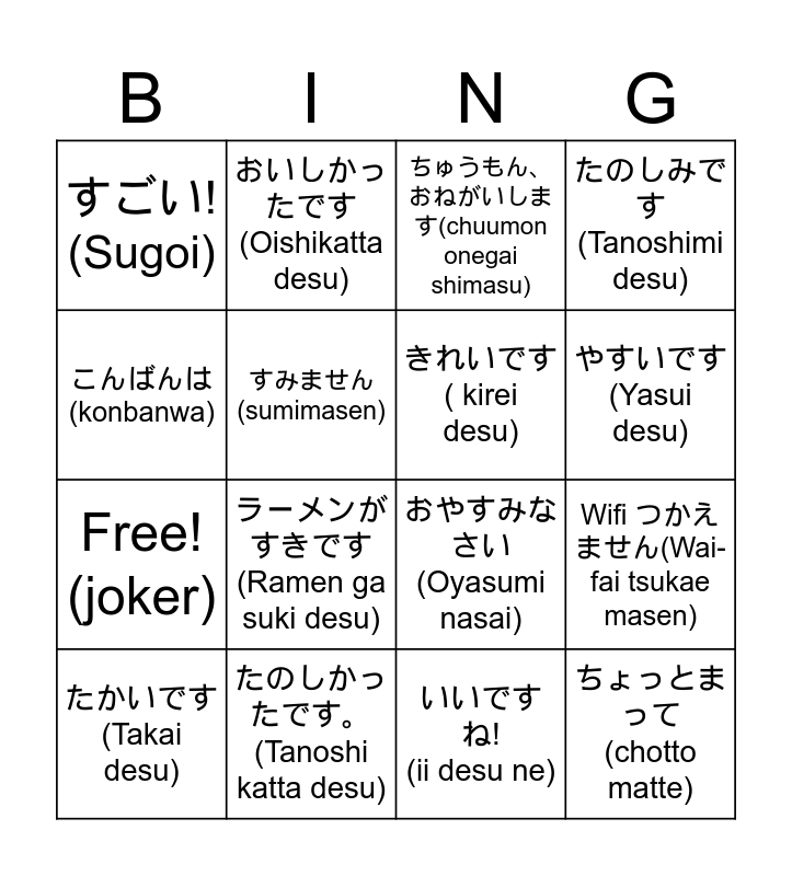 This bingo card has 20 words: Wifi つかえません(Wai-fai tsukae masen), わかりました(Wakari ari mashita), ちゅうもん、おねがいします(chuumon onegai shimasu), またね(Matane), たかいです (Takai desu), こんばんは(konbanwa), たのしかったです。 (Tanoshi katta desu), すごい! (Sugoi), Free! (joker), おいしかったです(Oishikatta desu), ラーメンがすきです (Ramen ga suki desu), おやすみなさい(Oyasumi nasai), すみません(sumimasen), ちょっとまって(chotto matte), きれいです ( kirei desu), いきましょう(ikimashou), やすいです (Yasui desu), たのしみです (Tanoshimi desu), いいですね! (ii desu ne) and まだです (Mada desu).