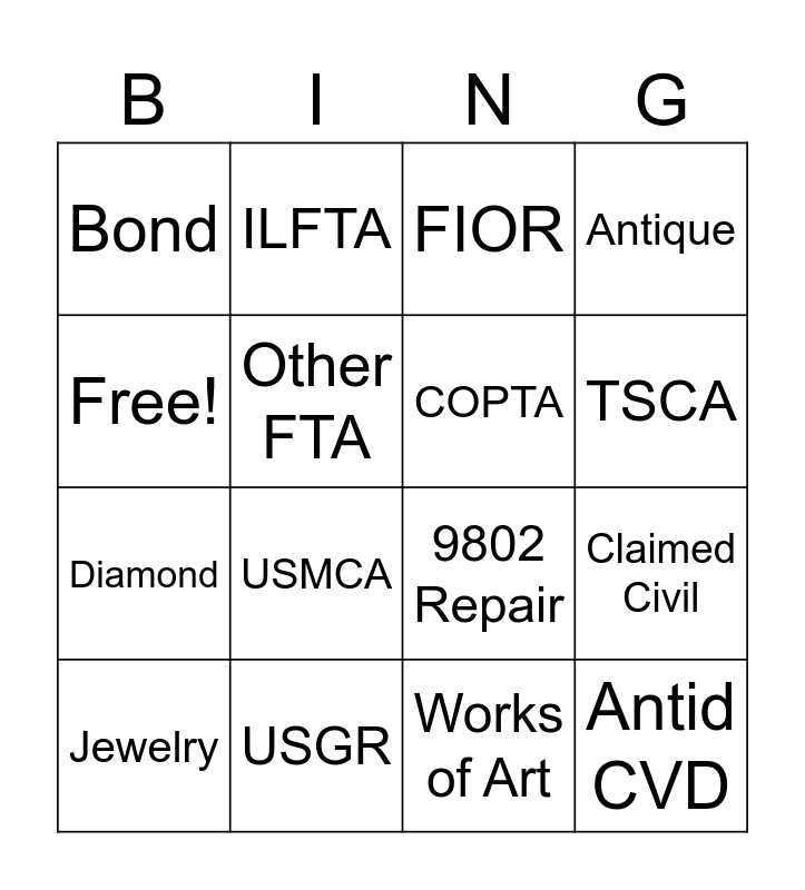 This bingo card has 16 words: USGR, Claimed Civil, FIOR, Bond, Diamond, ILFTA, 9802 Repair, Works of Art, Free!, Other FTA, Jewelry, Antique, USMCA, TSCA, COPTA and Antid CVD.